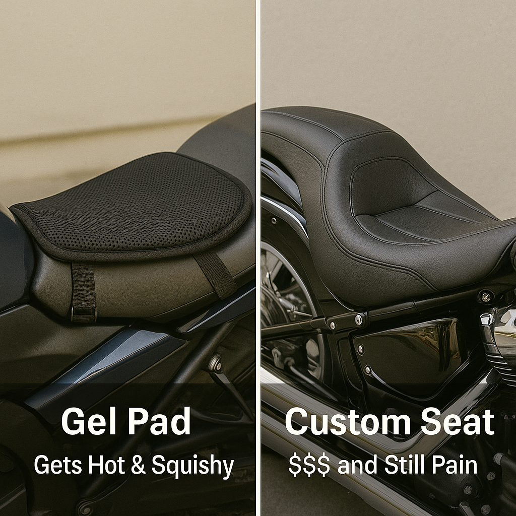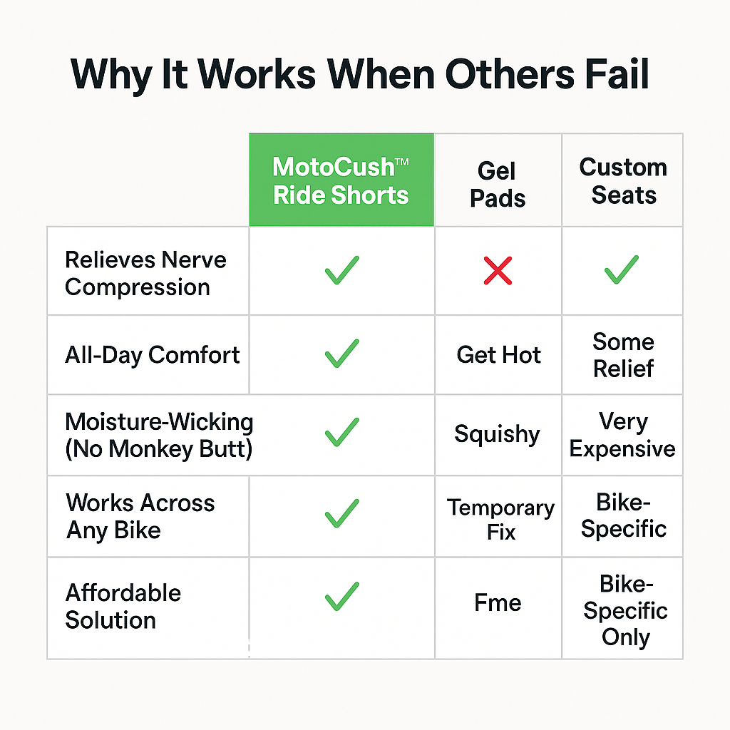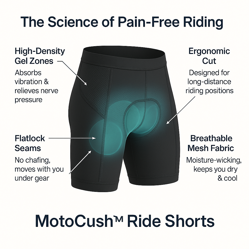 Unlike cycling shorts (built for a forward-lean posture) or generic pads (that slide, bunch, and overheat), this is engineered for motorcyclists.