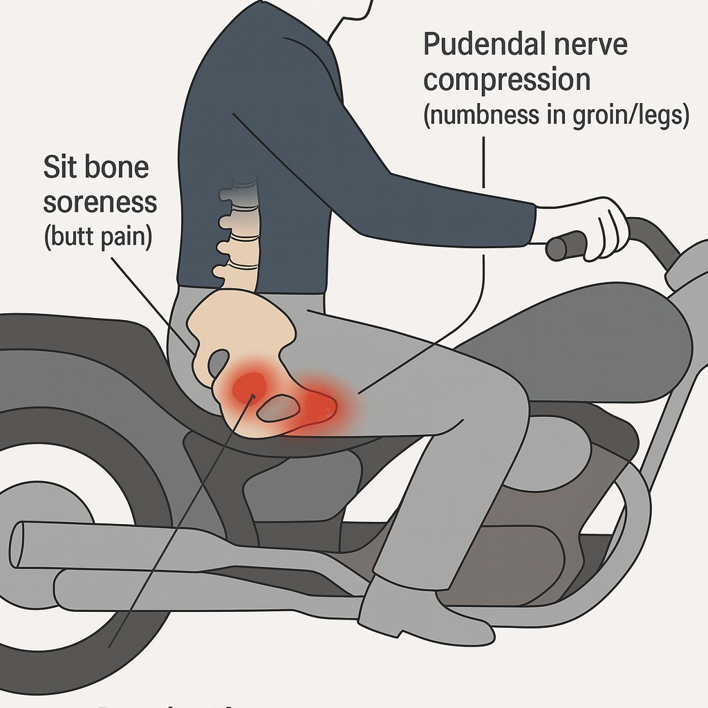When you sit for long periods on a motorcycle seat, all your weight presses into a few small contact points. That pressure slowly pinches the pudendal nerve (yes, the one responsible for sensation “down there”) and squeezes blood vessels shut.